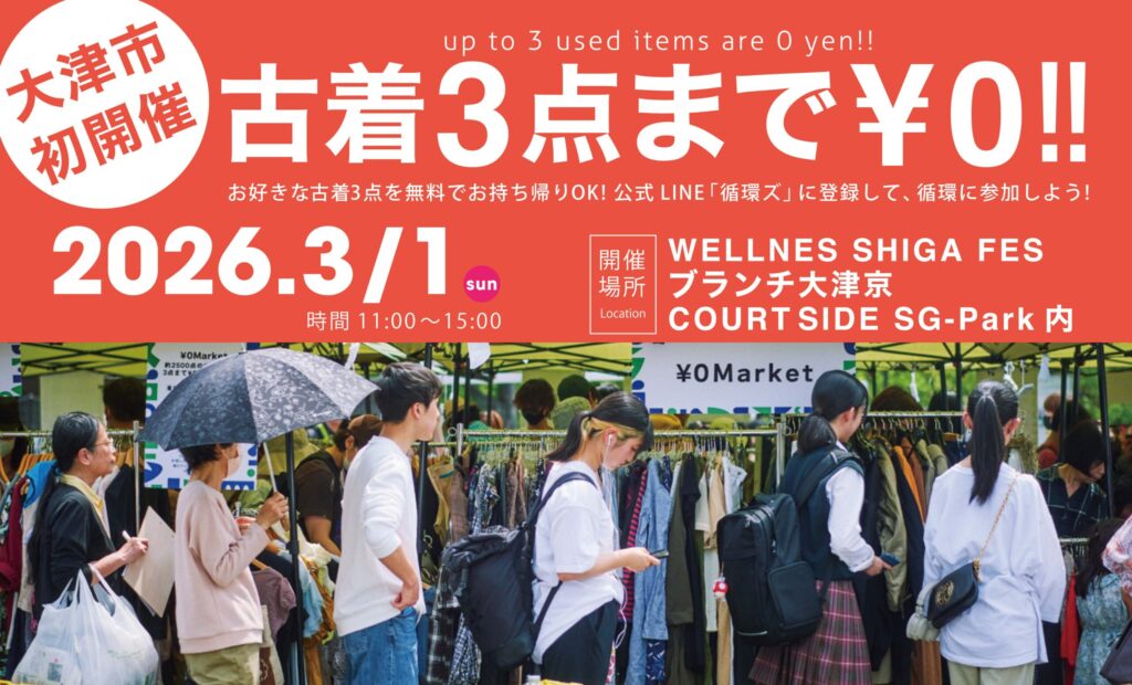 古着 (国内リユースアイテム)がおひとりさま3点まで0円!!¥0マーケットが滋賀県大津市の「COURT SIDE SG-Park」で開催。