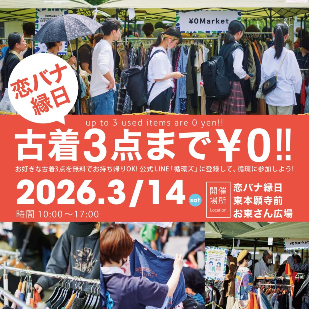 古着 (国内リユースアイテム)がおひとりさま3点まで0円!!¥0マーケットが恋バナ縁日@東本願寺前「お東さん広場」で開催。